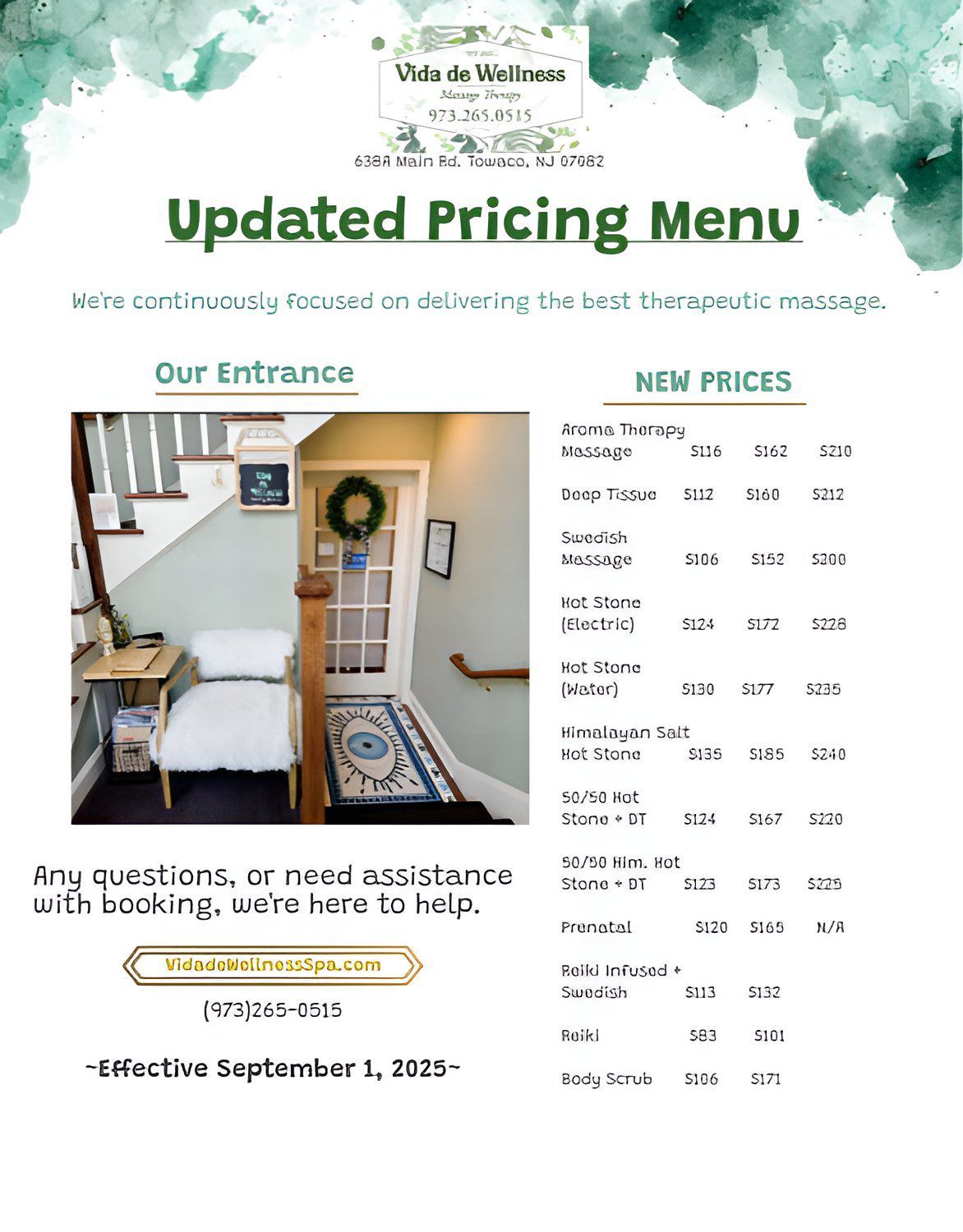 Please provide 24 hours' notice for cancellations via call, voicemail or text to Vida de Wellness Spa. Emergencies are understood. ***Newest Cancellation/No-Show Policy*** 1st offense: forgiven, 2nd offense: 25% charge of missed service, 3rd offense: 50% charge of missed service. Thank you for your understanding.